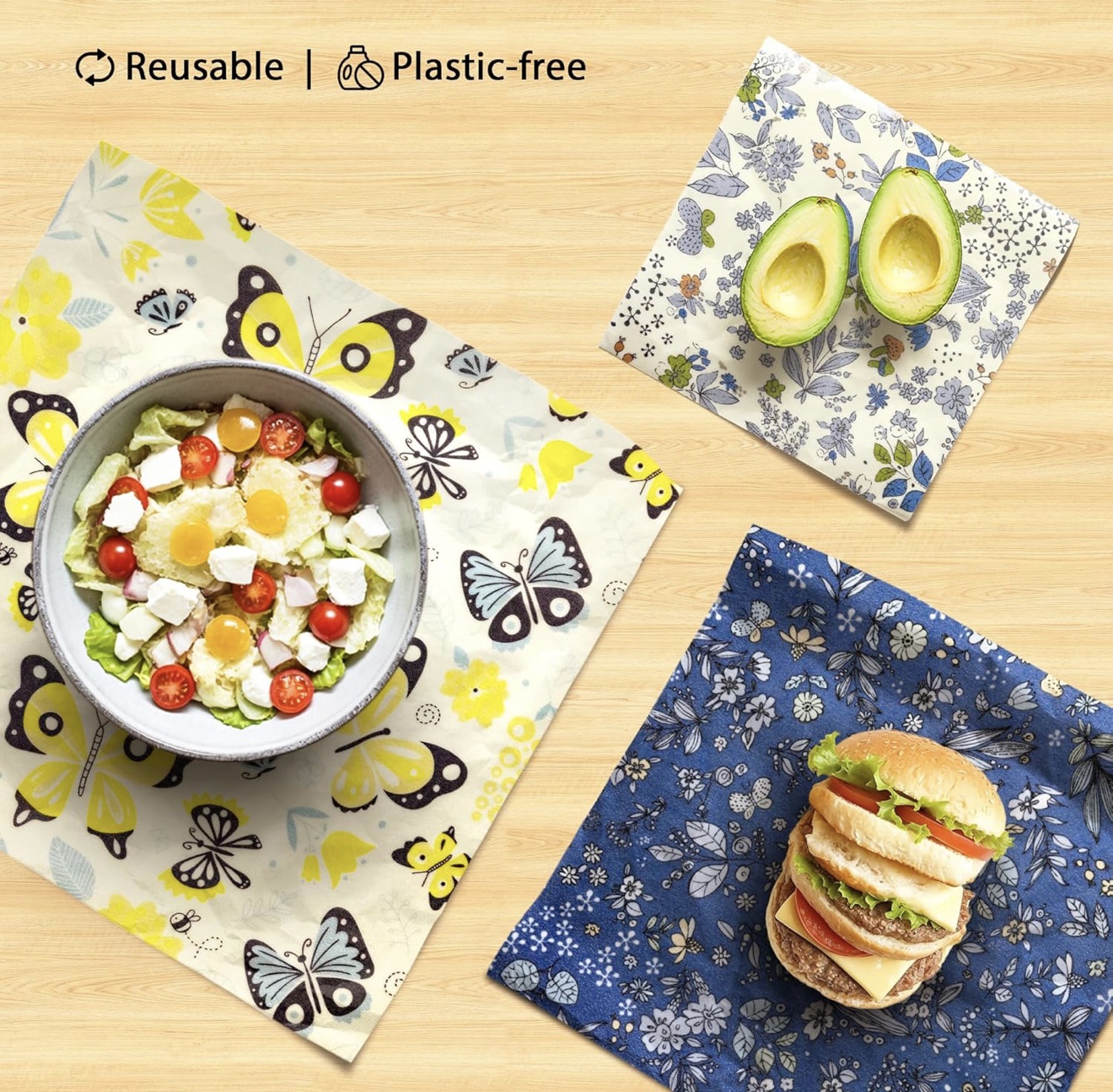 Reusable beeswax wrap set made from organic cotton, beeswax, pine resin, and jojoba oil. An eco-friendly, plastic-free solution for wrapping food, covering bowls, and reducing kitchen waste.